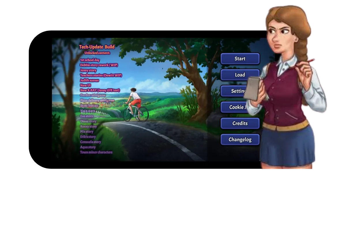In the Mod Version, you can enjoy unlimited Cookie Jar scenes and replay any unlocked moments whenever you want. You can access the Cookie Jar from the game’s general options or through the debug menu. All the special scenes are automatically unlocked for you. Just a heads-up: the final romance scenes need to be played twice in the main game before they appear in the Cookie Jar.
